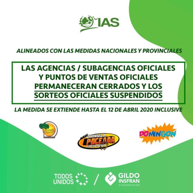 A su vez, se extiende los plazos de cobros de premios, cuya caducidad opera en este lapso de tiempo. Como también continúan suspendidos por el periodo que dure la medida de prevención, todos los sorteos de Quinielas, Loterías y Bingos que se realizan desde nuestra sala de sorteos.